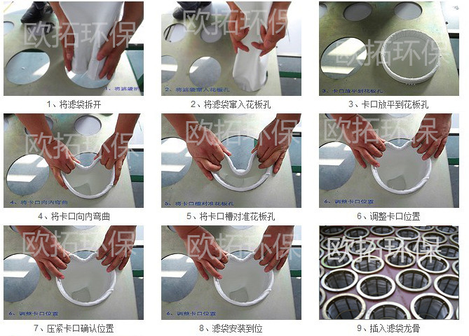 正確的 安裝除塵器布袋 ,不僅可以 避免除塵器布袋 的機(jī)械損傷,還可以延 長(zhǎng)除塵器布袋 的使用壽命。在安裝除塵器布袋之前要注意,存放時(shí)要注意除塵器布袋遠(yuǎn)離火源,要防潮,避免陽光等強(qiáng)光直射,防止重要擠壓。安裝前需要對(duì)每一條布袋進(jìn)行檢查,防止機(jī)械損傷。除塵布袋的安裝應(yīng)當(dāng)在除塵器全部安裝工作完成后進(jìn)行。先拆除噴吹管再安裝除塵布袋。布袋的搬運(yùn)和存放時(shí)要注意防止除塵布袋與周圍硬物、尖角物件發(fā)生觸碰現(xiàn)象。禁止腳踩、重壓等,避免發(fā)生破損的現(xiàn)象。 首先把除塵布袋從包裝箱中取出后(須立即安裝到花板孔中,不可以預(yù)先把除塵布袋取出放置一旁)。裝置布袋的辦法是先將布袋由箱體花板孔中放入袋室,然后將袋口上部的彈簧圈捏成凹型,放入箱體的花孔板中,再使彈簧圈恢復(fù),使其嚴(yán)密地壓緊在花孔圓周上,最后將袋籠從袋口悄悄插入,直到袋籠上部的護(hù)蓋的確壓在箱體內(nèi)花板孔上為止。為避免布袋踩壞,請(qǐng)求每裝好一個(gè)布袋,就裝一個(gè)袋籠。如圖 :